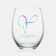 La obra de arte muestra la letra del alfabeto "Y" en una letra de escritura artística de un diseño abstracto colorido - extraída de una foto de plantas de primavera capturadas usando una técnica especial de cámara, junto con la tipografía de personalizable para nombre u otra personalización en fuente azul. Personalice esta copa de vino sin tallo monogramada añadiendo el nombre o las palabras de su elección para que se adapten mejor a su propósito o evento. Para solicitudes o preguntas especiales, póngase en contacto con el artista en wafadahdalcreates@gmail.com. © Wafa Y. Dahdal - Reservados todos los derechos.