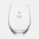 Estos elegantes vasos de vino sin tallo minimalista hacen grandes regalos de fiesta nupcial náutica o favores de boda para tu boda de New England, Maine, Nantucket o yacht club. El diseño minimalista limpio incluye sus nombres, fecha de boda y ubicación en letras clásicas de serif azul marino. Un ilustracion de ancla náutica azul marino completa el diseño.