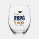 Customize your own navy blue and gold Class of 2026 graduate wine glass gift for a college graduation party. Cool varsity letters for the year on a great custom commemorative keepsake for university seniors.
