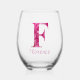 El diseño presenta la letra del alfabeto "F" en un patrón floral rosado derivado de una fotografía de flores primaverales, junto con la tipografía de escritura de personalizable para nombre u otra personalización. Personalice esta copa de vino sin tallo monogramada añadiendo el nombre o las palabras de su elección para que se adapten mejor a su propósito o evento. Para solicitudes o preguntas especiales, póngase en contacto con el artista en wafadahdalcreates@gmail.com. © Wafa Y. Dahdal - Reservados todos los derechos.