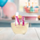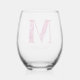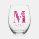 El diseño presenta la letra del alfabeto "M" en un patrón floral rosado derivado de una fotografía de flores primaverales, junto con la tipografía de escritura de personalizable para nombre u otra personalización. Personalice esta copa de vino sin tallo monogramada añadiendo el nombre o las palabras de su elección para que se adapten mejor a su propósito o evento. Para solicitudes o preguntas especiales, póngase en contacto con el artista en wafadahdalcreates@gmail.com. © Wafa Y. Dahdal - Reservados todos los derechos.