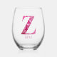 El diseño presenta la letra del alfabeto "Z" en un patrón floral rosado derivado de una fotografía de flores primaverales, junto con la tipografía de escritura de personalizable para nombre u otra personalización. Personalice esta copa de vino sin tallo monogramada añadiendo el nombre o las palabras de su elección para que se adapten mejor a su propósito o evento. Para solicitudes o preguntas especiales, póngase en contacto con el artista en wafadahdalcreates@gmail.com. © Wafa Y. Dahdal - Reservados todos los derechos.