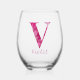 El diseño presenta la letra del alfabeto "V" en un patrón floral rosado derivado de una fotografía de flores primaverales, junto con la tipografía del guión de personalizable para nombre u otra personalización. Personalice esta copa de vino sin tallo monogramada añadiendo el nombre o las palabras de su elección para que se adapten mejor a su propósito o evento. Para solicitudes o preguntas especiales, póngase en contacto con el artista en wafadahdalcreates@gmail.com. © Wafa Y. Dahdal - Reservados todos los derechos.