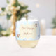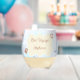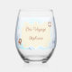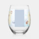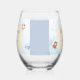 Two lines of customizable text highlight this ocean-themed stemless wine glass featuring a single crab, a life preserver and a note in a floating bottle.