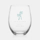 Estos elegantes vasos de vino sin tallo minimalista hacen grandes regalos de novia o favores de boda de destino. El diseño minimalista limpio incluye los n nombres, la fecha de boda y la ubicación en las letras clásicas del serif negro. Un dúo de palmeras tropicales de azul turquesa verde azulado completa el diseño.