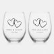 Crea un conservador significativo con estas gafas elegantes. Personalice las copas de vino sin tallo con los nombres de las parejas y la fecha de boda. Se puede editar el elegante y moderno guión. Dos corazones entrelazados, dibujados a mano, dan un toque romántico original. Dibujé estos corazones en la almohadilla de mi hijo. Una excelente decoración de boda o de mesa boda.