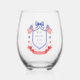 This patriotic bridal shower wine glasses features a watercolor crest with a light red white and blue patriotic crest with American flags and a blue bow. Text in the center of the crest says "Red, white and I do." You can personalize with your event date.