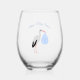 Esta impresionante copa de vino sin tallo presenta una imagen gráfica de una cigüeña blanca adorable con plumas de cola negra sujetándose a un paquete azul pálido de mantas. Hay un texto azul en el bulto que dice "Baby Boy". Este diseño es perfecto para celebrar a un bebé. Hay un texto personalizado para que puedas incluir un mensaje haciendo de esto un diseño hermoso para una ducha de bebé, revelación de género o para celebrar un recién nacido.
