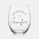 Personalizado de la dama de honor Personalizado Nombre Wedding Party Stemless Wine Glass presenta el nombre de la dama de honor con el texto "Bridesmaid" acentuado con un caprichoso corazón de amor. Personalizado hecha para las damas de honor. Hace un fabuloso regalo de dama de honor o un favor de boda. Diseñado por ©2025 Evco Studio www.zazzle.com/store/evcostudio