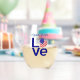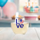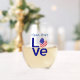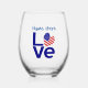 La copa de vino sin cáscara incluye la palabra "AMOR" en letras azules con bandera en forma de corazón de los Estados Unidos de América para la "O". Añade un nombre arriba, también en letras azules, para ti o un regalo. Perfecto para celebrar el 4 de julio, una reunión familiar o de amigos, un grupo de viajes o un club. Hace un regalo de bienvenida para celebrar el patrimonio de los Estados Unidos.