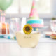 Boho floral Yellow Sunflower bloom stemless wine glass, with customizable script typography. Enjoy this personalized accessory item for yourself or as a gift for someone special.