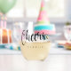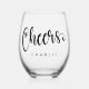 Gafas de vino sin cáscara con el texto en color negro o personalizado "Saludos" en un tipografía tierno y su nombre personalizado debajo.