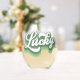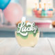 Esta divertida copa de vino sin raíces presenta un guión de estilo retro que dice "Suertudo" en una fuente verde y blanca angustiada. ¡Ideal para celebrar el Día de San Patricio!