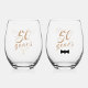 Glass 1: El diseño frontal presenta lectura de letras de color dorado, "50 años" en un guión elegante. El número de años es personalizable para satisfacer sus necesidades. La imagen de un collar de corazón denso se muestra debajo de la redacción. Revertir muestra el texto del personalizable, "¡y mucho más por venir!", con el mismo tipo de letra elegante. Vidrio 2: El diseño frontal es el mismo que el vidrio 1, excepto que la imagen de abajo es de una corbata negra. Al revés se muestra el texto del personalizable que dice: "¡y sigue fuerte!" El diseño del personalizable también está escrito en plata.