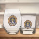 Insignia escudo del clan MacKay rodeada por una correa y hebilla sobre fondo azul tartán. Texto personalizado en ambos lados.