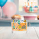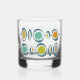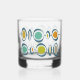 Add a pop of color to your kitchen or bar cart with this fantastic retro whiskey glass. It features abstract hanging geometric circles in the colors of turquoise blue, orange, avocado green, tan, gold, and blue.
