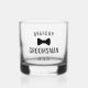 Vidrio de whisky personalizado con el título 'GROOMSMAN", corbata de arco, fecha y nombre.
