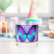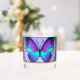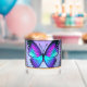 Una mariposa vibrante con tonos azules y violetas se centra en un diseño circular ornamentado, rodeado de intrincados motivos florales y joyas decorativas. La composición general se caracteriza por una estética de vidrio manchado con una mezcla armoniosa de colores y simetría.
