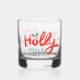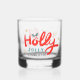 Navidades Holly Jolly Fun Winter Personalized Name Whiskey Glasses presenta el texto "Holly Jolly en la tipografía de escritura de caligrafía moderna en rojo y azul y personalizado con tu nombre personalizado. Acentuado con hojuelas y copos de nieve. Los regalos perfectos para Navidades y vacaciones o para fiestas Navidades. Diseñado por ©Evco Holidays www.zazzle.com/store/evcoholidays