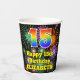 Este colorido y divertido diseño de taza de papel con temática de cumpleaños presenta un gran número "15" con un patrón inspirado en el gradiente del espectro arcoiris. También incluye el mensaje "Feliz cumpleaños número 15", y un nombre de personalizable. El fondo presenta un patrón multicolor inspirado en fuegos artificiales de celebración que estallan. Coloridas y vibrantes tazas de papel como esta pueden ser divertidas de tener en una fiesta de cumpleaños/celebración que se lleva a cabo en celebración del 15 cumpleaños de alguien. [~Z0000539]