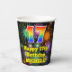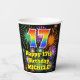 Este divertido y colorido diseño de taza de papel temático de cumpleaños presenta un gran número "17" con un patrón inspirado en el gradiente del espectro arcoiris, junto con el mensaje "Feliz cumpleaños número 17", y un nombre personalizado. El fondo presenta un colorido estallido de fuegos artificiales de celebración inspirado en el. Coloridas y vibrantes tazas de papel como esta podrían ser divertidas de tener en una celebración/fiesta de cumpleaños que se lleva a cabo en celebración del 17 cumpleaños de alguien. [~Z0000539]