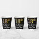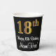 Este elegante, elegante y sofisticado diseño de tazas de papel con temática de cumpleaños presenta un gran número ordinal "18th" que tiene un patrón de gradiente inspirado en el oro imitación/faux, junto con el mensaje de bienvenida de cumpleaños "Feliz 18th Birthday" y un nombre editable con un tipo de letra estilo script. También tiene un fondo de color negro. Se pueden usar tazas de papel elegantes como esta cuando se aloja a un fiesta para alguien en celebración de su 18º cumpleaños. [~Z0000538]