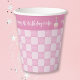 Esta dulce y caprichosa taza de papel está llena con un adorable diseño de tablero de ajedrez rosa, con espacio en la parte superior para añadir texto celebrando a sus pequeños por el primer cumpleaños. Esto es parte de la primera colección de pasteles de cumpleaños, busca platos coordinados, bolsos de favores, invitaciones y más.