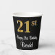 Este elegante, elegante y lujoso diseño de tazas de papel con temática de cumpleaños presenta un gran número ordinal "21st" que tiene un patrón de gradiente falso/imitación de color dorado, junto con el mensaje de bienvenida de cumpleaños "Feliz cumpleaños 21", y un nombre editable en un tipo de letra estilo script. El fondo es negro de color. Las tazas de papel como esta podrían ser usadas en una fiesta de cumpleaños para alguien que está celebrando su 21º cumpleaños. [~Z0000538]