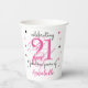 Cups de papel de cumpleaños 21 con temática rosa personalizado celebrando 21 años fabulosos en tipografía de escritura fresca rosa y negra. La parte trasera está decorada con franjas acuáticas rosadas multicolores de color rojizo. Las plantillas de texto simples se pueden personalizar con el nombre y la edad.