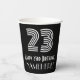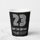 Este estilo vintage y el inspirado diseño de la copa de papel inspirado en el estilo de los años 20-30 presentan un gran estilo Art Déco inspirado en el número "23", además del mensaje de bienvenida de cumpleaños "Feliz cumpleaños número 23" y un nombre de personalizable. El fondo es negro de color. Se pueden usar vasos de papel como este para celebrar el cumpleaños 23 de alguien. [~Z0000542]
