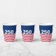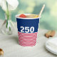In celebration of America's 250th birthday, this paper cup has a blue field at the top with 250 in white text. It has red and white stripes at the bottom that is reminiscent of the American flag.