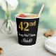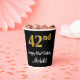 Este lujoso, sofisticado y elegante diseño de tazas de papel con temática de cumpleaños presenta un gran número ordinal "42nd" con un aspecto de imitación/faux de oro, además del mensaje de bienvenida de cumpleaños "Feliz cumpleaños número 42", y un nombre editable con un tipo de letra estilo script. El fondo es negro de color. Se pueden usar lujosos vasos de papel como este cuando se organiza una fiesta de cumpleaños para alguien que celebra su 42 cumpleaños. [~Z0000538]
