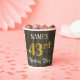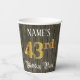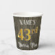 This elegant and luxurious birthday themed paper cup design features a custom name and the message “43rd Birthday Party”. The large number “43rd” has an imitation/faux gold-inspired coloring pattern, and the words “Birthday Party” are in fancy script-style text. The background has an imitation/faux woodgrain-inspired appearance. Opulent, ornate paper cups like this might be useful at a birthday party being held to celebrate somebody’s 43rd birthday. [~Z0000568]