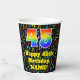 Este fascinante y divertido diseño de taza de papel de cumpleaños con temática musical cuenta con un gran número "45" con un patrón inspirado en el gradiente del espectro del arco iris. También incluye el mensaje "Feliz cumpleaños número 45", y un nombre editable. El fondo presenta un patrón multicolor con notas musicales y símbolos de varios colores y tamaños. Vibrantes y coloridas tazas de papel como esta pueden ser divertidas de usar en una fiesta de cumpleaños que se celebra para celebrar el 45 cumpleaños de alguien. [~Z0000541]