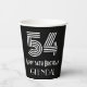 El diseño de esta copa de papel inspirado en el estilo de los años 20-1930 presenta un gran estilo Art Déco inspirado en el número "54", junto con el mensaje de bienvenida de cumpleaños "Feliz cumpleaños número 54" y un nombre personalizado. También tiene un fondo de color negro. Viejas tazas de papel con tema de cumpleaños como esta podrían ser usadas en un fiesta para celebrar el cumpleaños 54 de alguien. [~Z0000542]