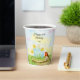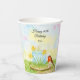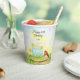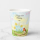 This spring-themed 60th birthday party cup features a daffodil-inspired cake, the flower of March, with a robin perched on a wooden cake stand, creating a cheerful and meaningful design to celebrate a new beginning.