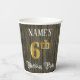 Este elegante y elegante diseño de tazas de papel con temática de cumpleaños presenta un nombre editable y el mensaje "Fiesta de cumpleaños número 6". El gran número "6th" tiene un patrón de color falso/imitación de inspiración dorada, y las palabras "Birthday Party" están en un texto ornamentado de estilo de escritura. El fondo tiene un patrón imitación/falso inspirado en el grano de madera. Opulentas y lujosas tazas de papel como esta podrían ser usadas en una fiesta de cumpleaños que se lleva a cabo para celebrar el sexto cumpleaños de alguien. [~Z0000568]