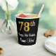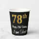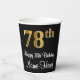 Este sofisticado, lujoso y elegante diseño de tazas de papel con temática de cumpleaños presenta un gran número ordinal "78th" con un aspecto de imitación/faux de oro, además del mensaje de bienvenida de cumpleaños "Happy 78th Birthday", y un nombre personalizado con un tipo de letra estilo script. También tiene un fondo de color negro. Las tazas de papel temáticas de cumpleaños como esta podrían ser una manera divertida de celebrar el cumpleaños 78 de alguien. [~Z0000538]
