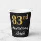 Este elegante, elegante y sofisticado diseño de tazas de papel con temática de cumpleaños presenta un gran número ordinal "83rd" con un aspecto falso/imitación de oro, junto con el mensaje de bienvenida de cumpleaños "Feliz cumpleaños número 83", y un nombre editable con un tipo de letra estilo script. También tiene un fondo de color negro. Elegantes tazas de papel con tema de cumpleaños como esta podrían ser usadas en una fiesta de cumpleaños para alguien que está celebrando su cumpleaños número 83. [~Z0000538]