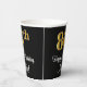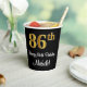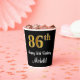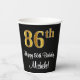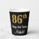 Este lujoso, elegante y elegante diseño de tazas de papel con temática de cumpleaños presenta un gran número ordinal "86th" que tiene un patrón de gradiente tipo oro falso/imitación, además del mensaje de bienvenida de cumpleaños "Feliz 86th Birthday", y un nombre personalizado con un tipo de letra estilo script. El fondo es negro de color. Elegantes tazas de papel con tema de cumpleaños como esta podrían ser usadas en un fiesta para celebrar el cumpleaños 86 de alguien. [~Z0000538]