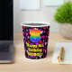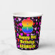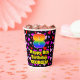 This fun and joyful birthday themed paper cup design features a large number “8” with a rainbow spectrum gradient inspired pattern, along with the message “Happy 8th Birthday,”, and a personalized name. The background features a pattern of heart shapes with colors like pink, purple, and red. Fun, happy paper cups like this might be fun to use at a birthday party being held to celebrate somebody’s eighth birthday. [~Z0000548]