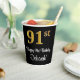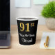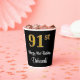 Este sofisticado, elegante y lujoso diseño de tazas de papel con temática de cumpleaños presenta un gran número ordinal "91st" con un patrón de gradiente similar al oro imitación/faux, junto con el mensaje de bienvenida de cumpleaños "Feliz cumpleaños 91", y un nombre personalizado con un tipo de letra estilo script. El fondo es negro de color. Se pueden usar vasos de papel como este para celebrar el cumpleaños 91 de alguien. [~Z0000538]
