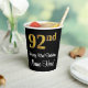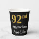 Este lujoso, elegante y sofisticado diseño de taza de papel para cumpleaños presenta un gran número ordinal "92nd" con un aspecto falso/imitación de inspiración dorada, además del mensaje de bienvenida de cumpleaños "Feliz cumpleaños 92º", y un nombre personalizado con un tipo de letra estilo script. El fondo es negro de color. Sofisticadas tazas de papel con temas de cumpleaños como esta podrían ser usadas en una fiesta de cumpleaños que celebra el cumpleaños 92 de alguien. [~Z0000538]