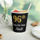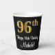 Este lujoso, sofisticado y elegante diseño de tazas de papel con temática de cumpleaños presenta un gran número ordinal "96º" con un aspecto imitación/falso de inspiración dorada, además del mensaje de bienvenida de cumpleaños "Feliz cumpleaños 96º", y un nombre personalizado con un tipo de letra estilo script. También tiene un fondo de color negro. Las tazas de papel como esta podrían ser usadas en una fiesta de cumpleaños realizada para celebrar el cumpleaños noventa y seis de alguien. [~Z0000538]