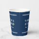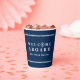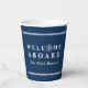 Bienvenidos a bordo de tazas de papel con envoltura azul marino y tipografía náutica con una rueda de barco reemplazando a la O en bienvenida. Añade el nombre de tu bote debajo.