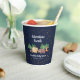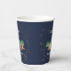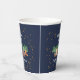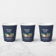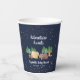 Cuidados tazas de papel de ducha de bebé con un ilustracion de animales de bosque con su tienda acampando en las montañas y el bosque, un overlay de estrellas de oro y "Adventure Awaits" y el nombre de la futura madre en libreto blanco con un fondo azul de medianoche.