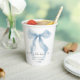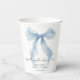 Elegantes tazas de papel para tu despedida de soltera con un diseño de acuarela de un lazo azul caprichoso, "algo azul antes de hacerlo" en una tipografía caligráfica chic, y el nombre de la novia y la fecha de la celebración en tipografía serif clásica.