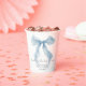 Copas de papel elegantes para tu despedida de soltera con un diseño de acuarela de un lazo azul caprichoso, "algo azul antes de hacerlo" en una tipografía caligráfica chic, y el nombre de la novia y la fecha de la celebración en tipografía serif clásica.