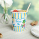 Cute Alice in Wonderland Happy Birthday paper cup para una fiesta de cumpleaños con temática de libro. Niña pequeña Alice con su vestido azul y el sombrerero loco en una taza de té en un borde azul bonito en una caprichosa tarjeta de rayas azules y amarillas. Beba en un fiesta de té para niños o en una lombriz.