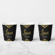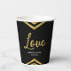 Estas tazas de papel modernas presentan un elegante diseño geométrico de chevron y la palabra "Amor" en lámina de oro falsa sobre un fondo negro; perfectas para una fiesta de compromiso o aniversario.